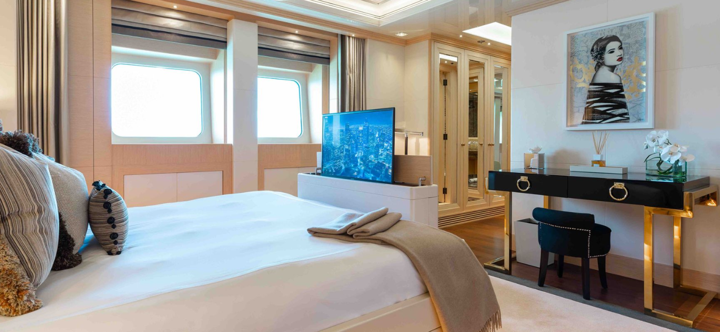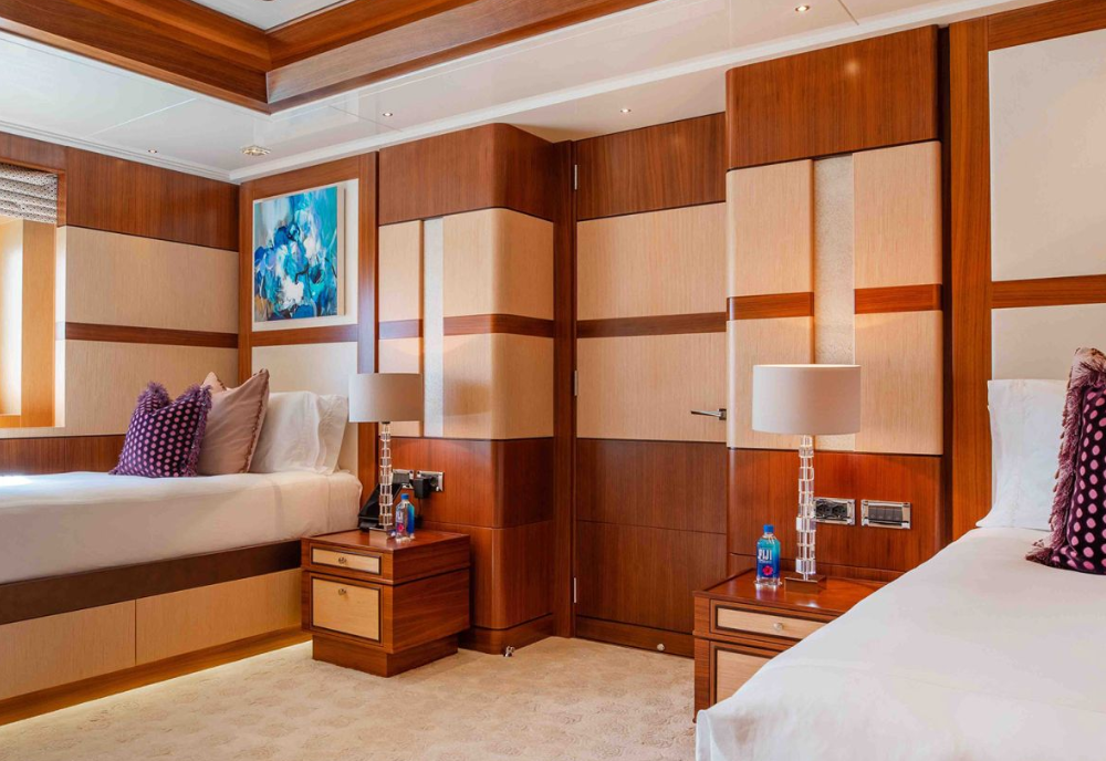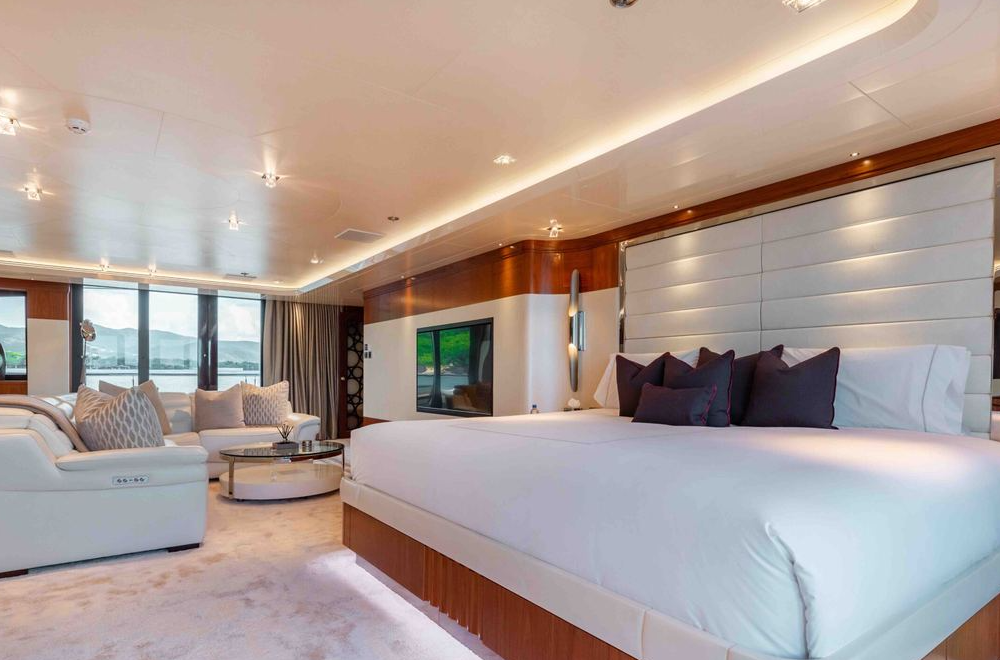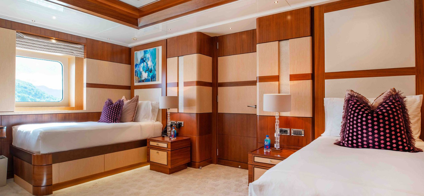 Quantum of Solace offers guest accommodation for up to 12 guests in 7 suites comprising a master suite, one VIP cabin and five twin cabins. The supremely spacious full beam master suite incorporates its own study. She is also capable of carrying up to 18 crew onboard to ensure a relaxed luxury yacht charter experience.