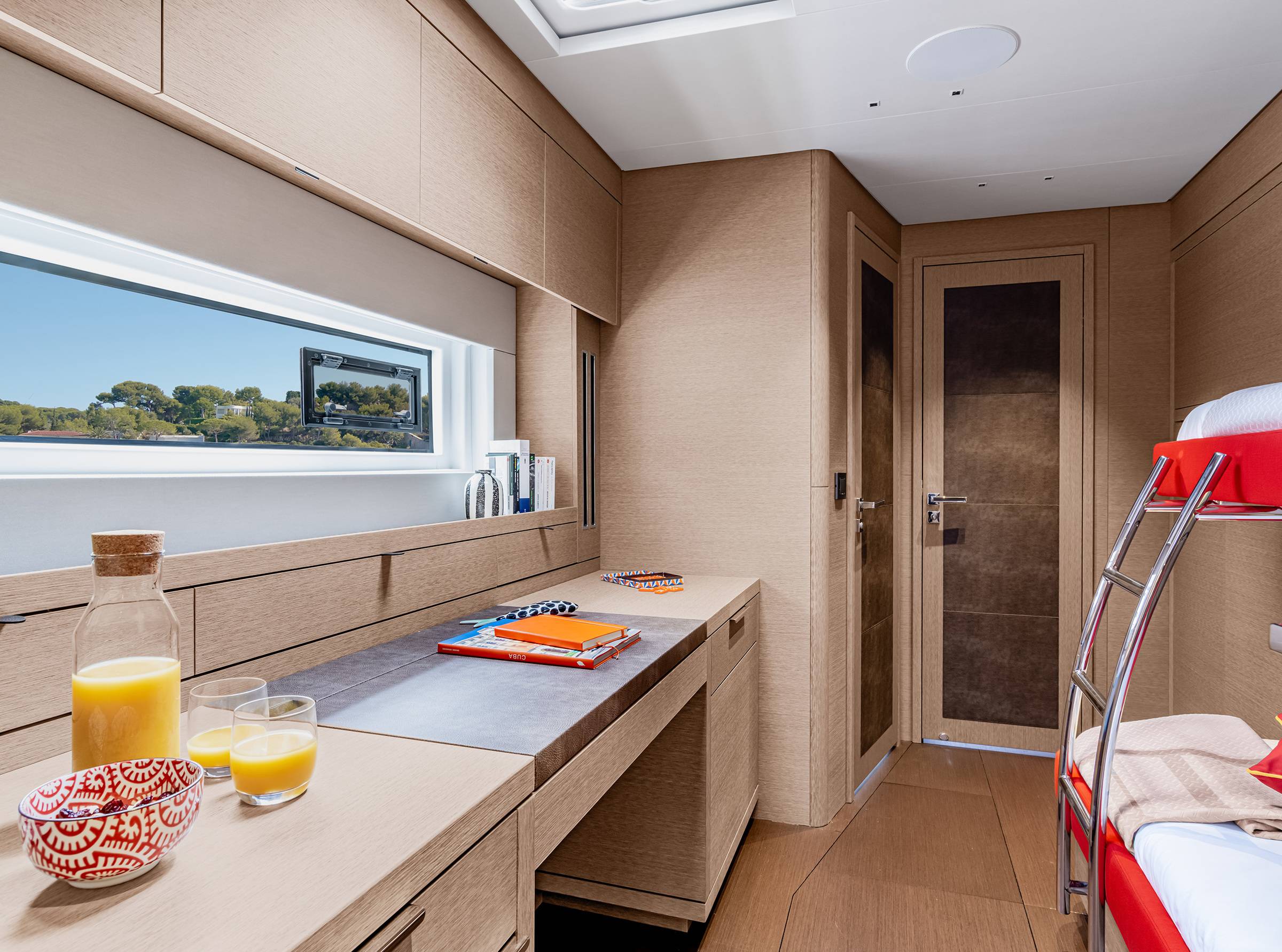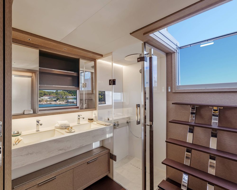 The main saloon is super-comfortable and abundant of open spaces and natural light. The same concept is applied to cabins, which enjoy good height and excellent natural light and views. Impressive interior headroom offers plenty of light and majestic sea views. A comfortable master cabin with swift access from the salon providing a comfortable bathroom with separate shower and toilet. 3 additional guest cabins all feature sea-facing beds and en-suite bathrooms all with separate bathrooms and toilets.