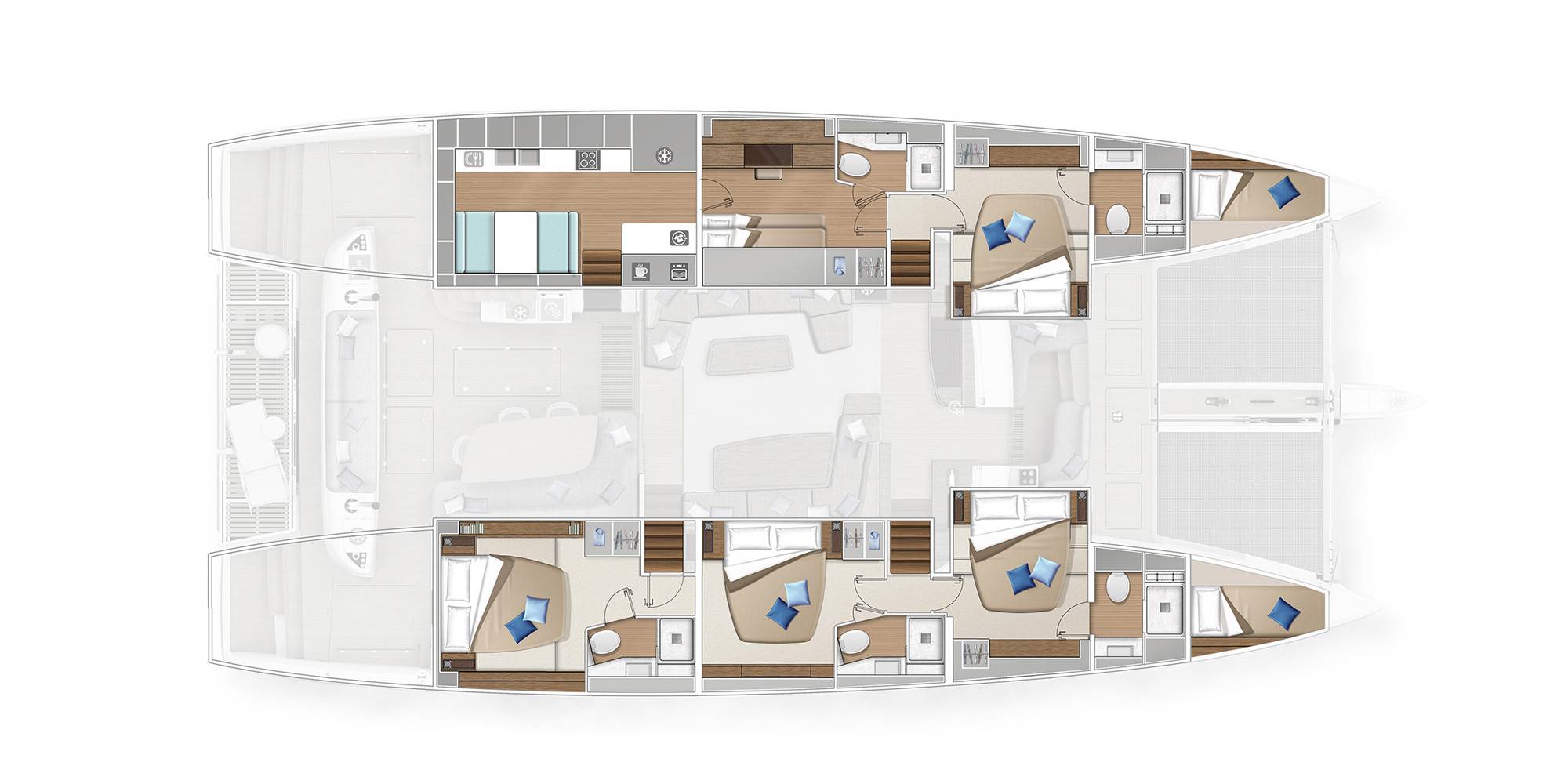 She has a minimal art-deco with high quality 5* material. High-end audio system with 25 speakers and individual use in each cabin and outdoor area. The Lagoon Sixty 5 also provides its lucky guests with a wide variety of watertoys which makes her ideal for families and friends!!
