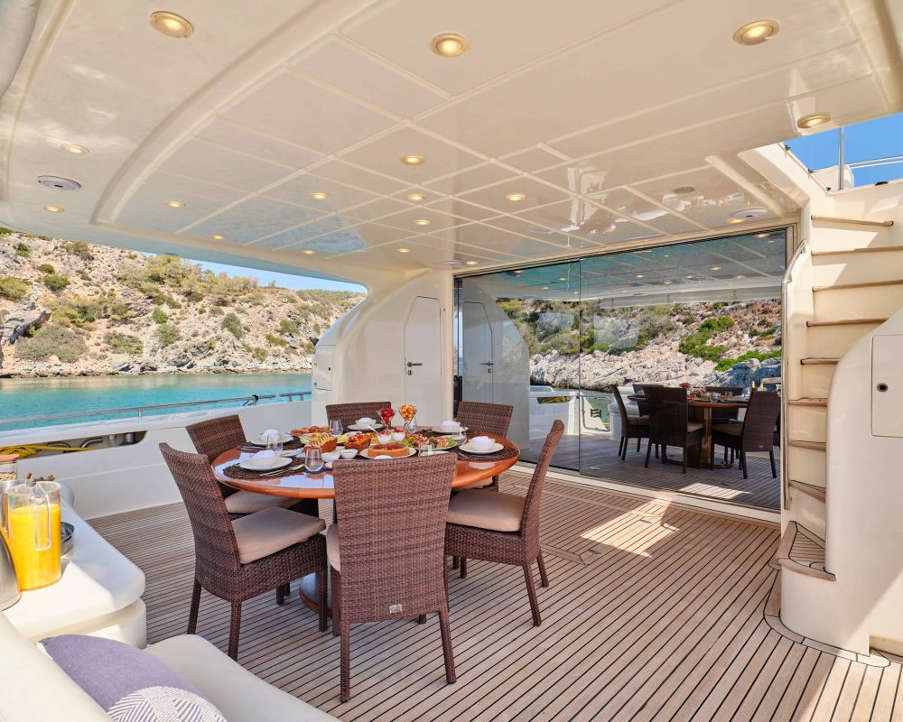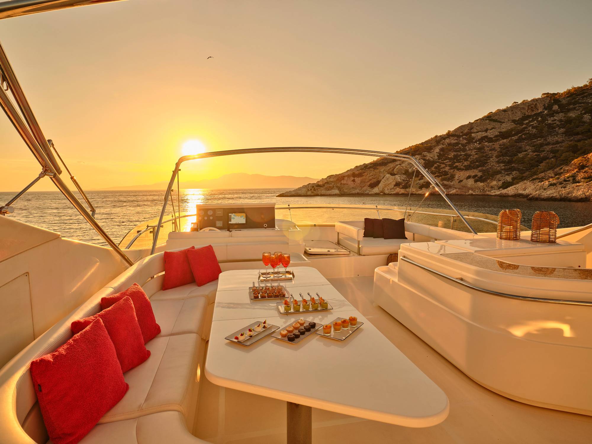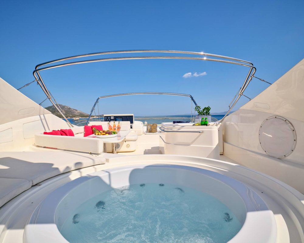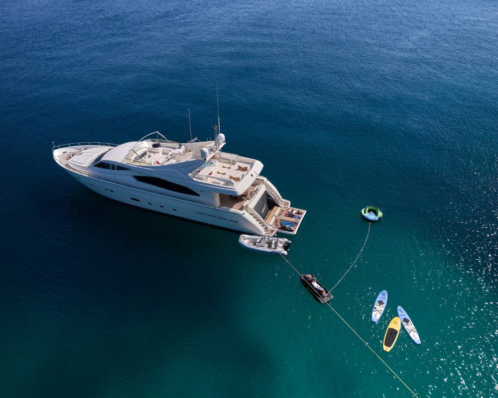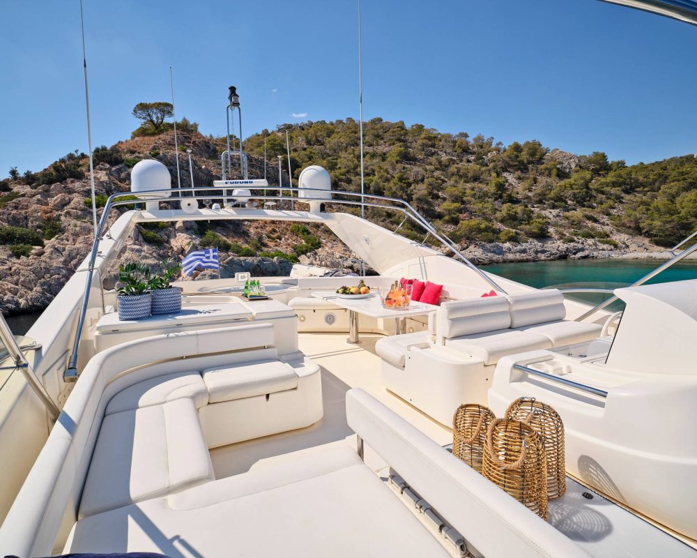 The 88 ft/26m Ferretti 880 motor yacht Estia Yi was built in 2004 by Ferretti and she has been through an extensive full refit in 2021. M/Y Estia Yi offers 4 lavish staterooms that accommodate up to 8+1 guests supercomfortably. Her layout includes a master suite, a VIP cabin and 2 twin cabins (one with an extra pullman berth), all with ensuite facilities. Her professional and experienced crew of 5 members take care of Estia Yi’s guests on board promising a once in a lifetime yachting experience. Among other amenities the M/Y Estia Yi features a spacious sundeck fully equipped with large sun beds for lounging, an alfresco dining area and a Jacuzzi. In addition, she provides an aft garage which opens and transformed into a swim platform ideal for beach club or romantic dining area. Estia Yi’s impressive leisure and entertainment facilities make her the ideal charter yacht for socializing and entertaining with family and friends