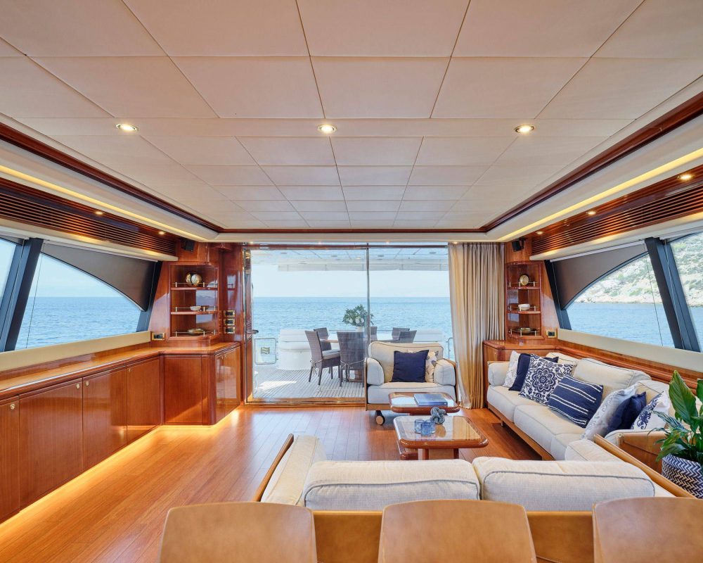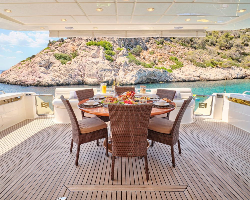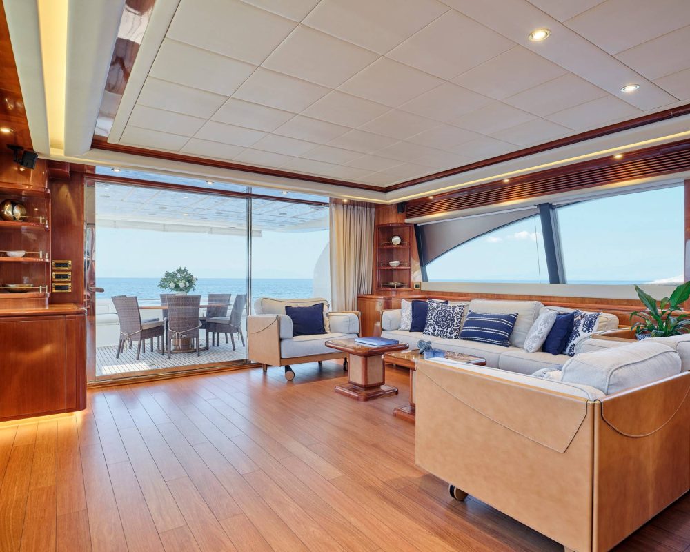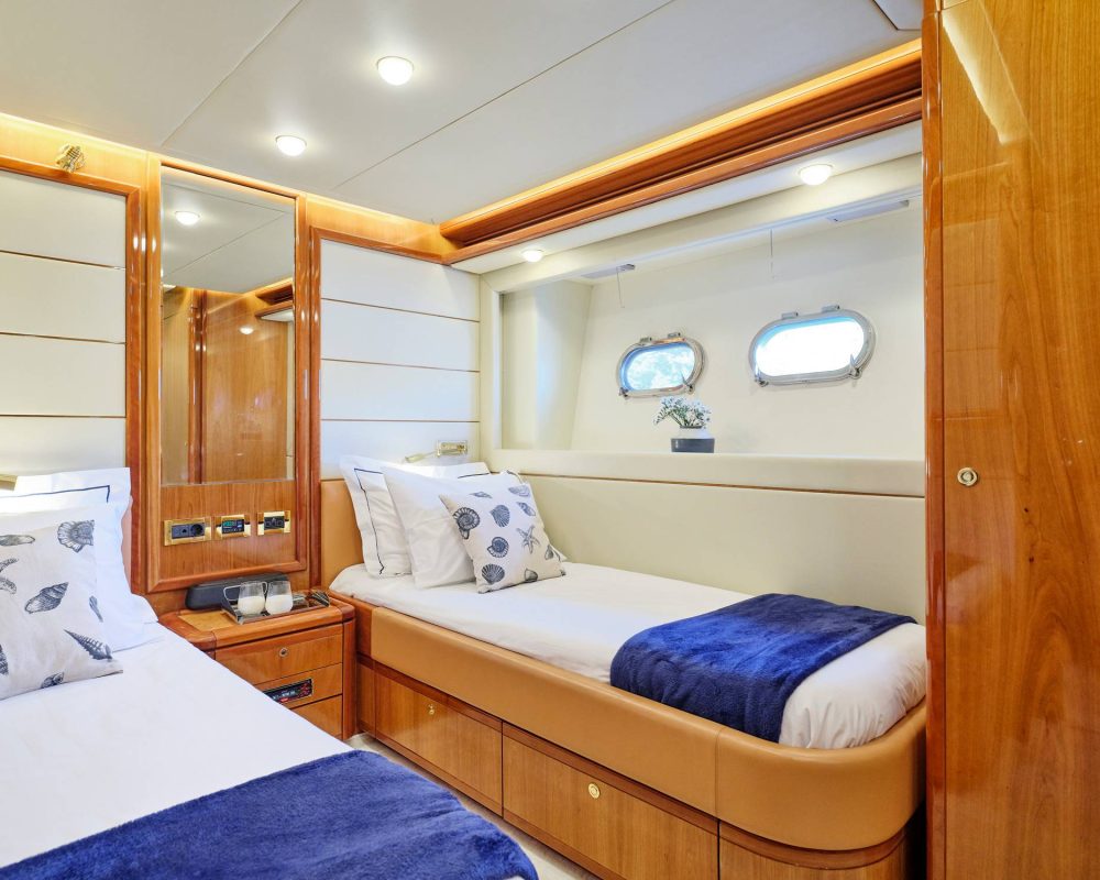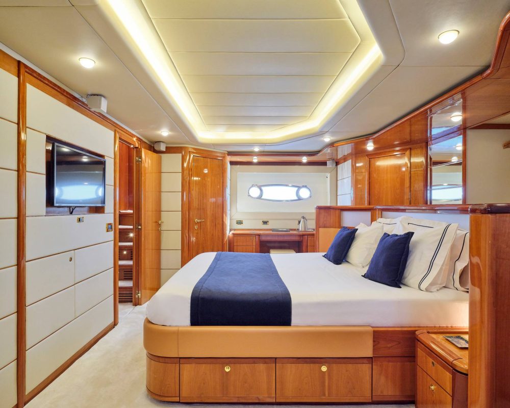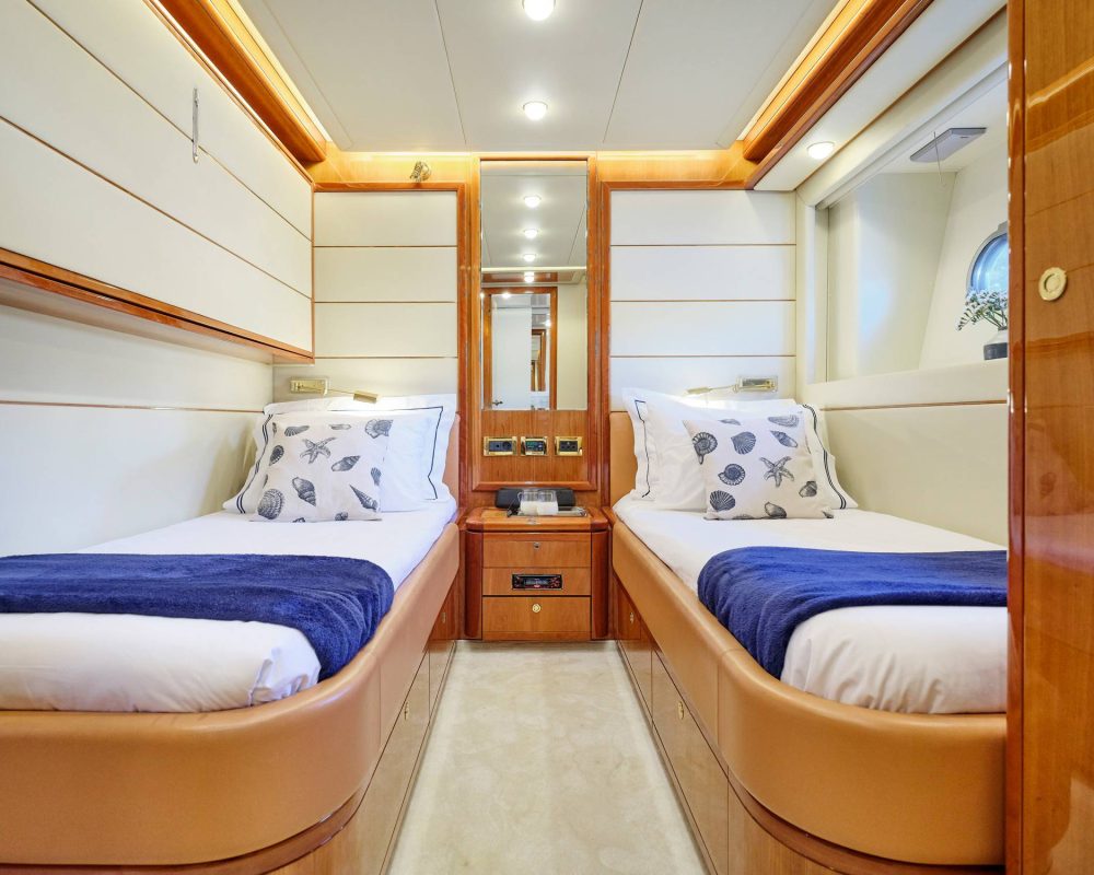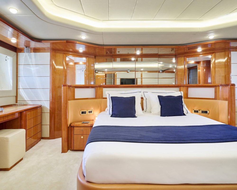 The 88 ft/26m Ferretti 880 motor yacht Estia Yi was built in 2004 by Ferretti and she has been through an extensive full refit in 2021. M/Y Estia Yi offers 4 lavish staterooms that accommodate up to 8+1 guests supercomfortably. Her layout includes a master suite, a VIP cabin and 2 twin cabins (one with an extra pullman berth), all with ensuite facilities. Her professional and experienced crew of 5 members take care of Estia Yi’s guests on board promising a once in a lifetime yachting experience. Among other amenities the M/Y Estia Yi features a spacious sundeck fully equipped with large sun beds for lounging, an alfresco dining area and a Jacuzzi. In addition, she provides an aft garage which opens and transformed into a swim platform ideal for beach club or romantic dining area. Estia Yi’s impressive leisure and entertainment facilities make her the ideal charter yacht for socializing and entertaining with family and friends