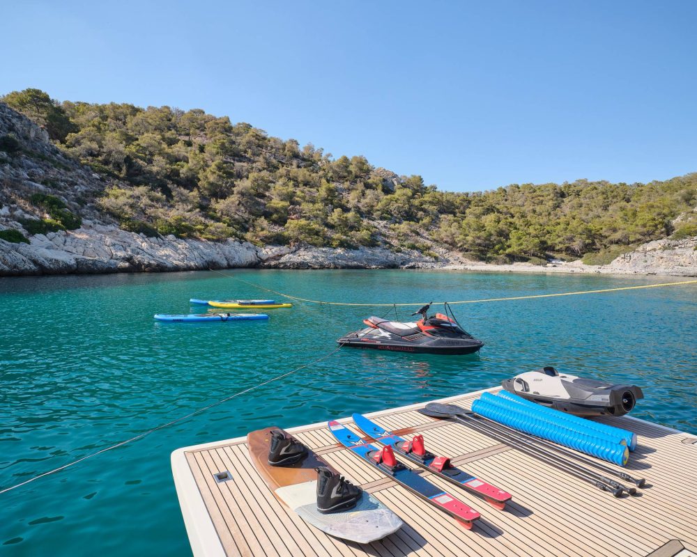 • 1x Avon Tender 4.00m with Yamaha 40HP outboard engine 1x Seado Spark / 2 seater Jet ski 1x Electrical Scooter 1x Sea Scooter Water Ski (adults & children) Monoski 3x Paddleboard (SUP) Snorkeling Equipment and Fishing Gear 1x Wakeboard 1x SeaBob Tubes Kneeboard Inflatable water toys (Donuts, beds and sofa small) Towable Sofa (3 seaters)