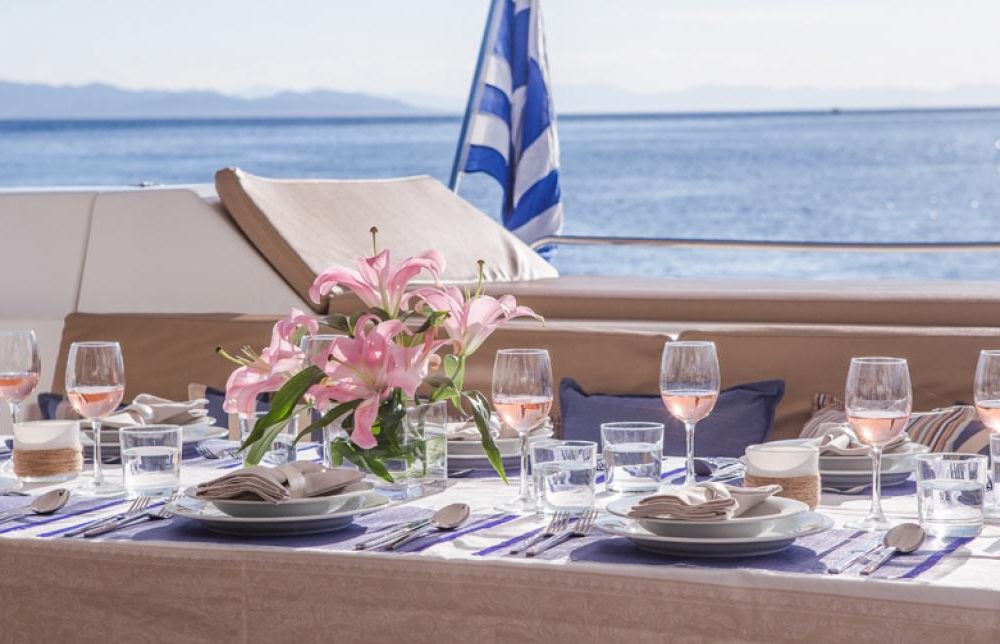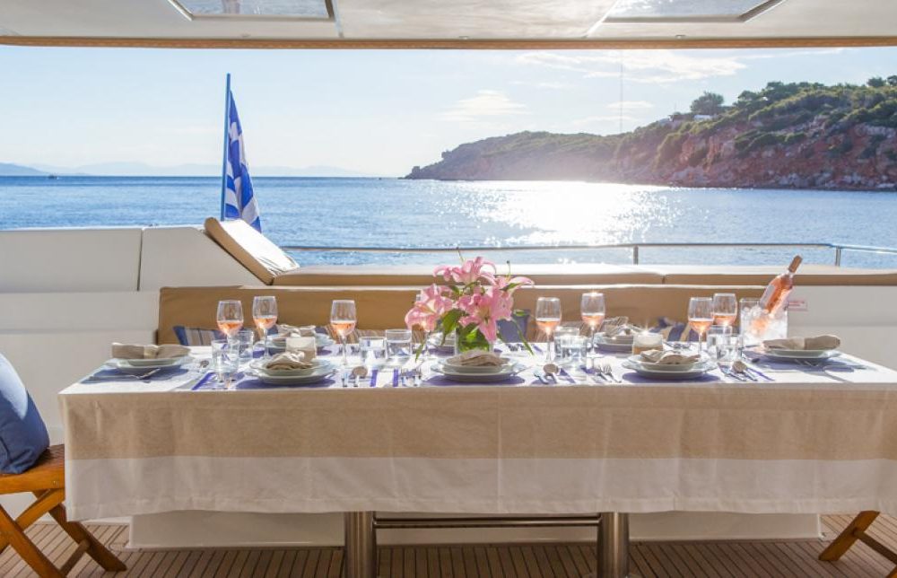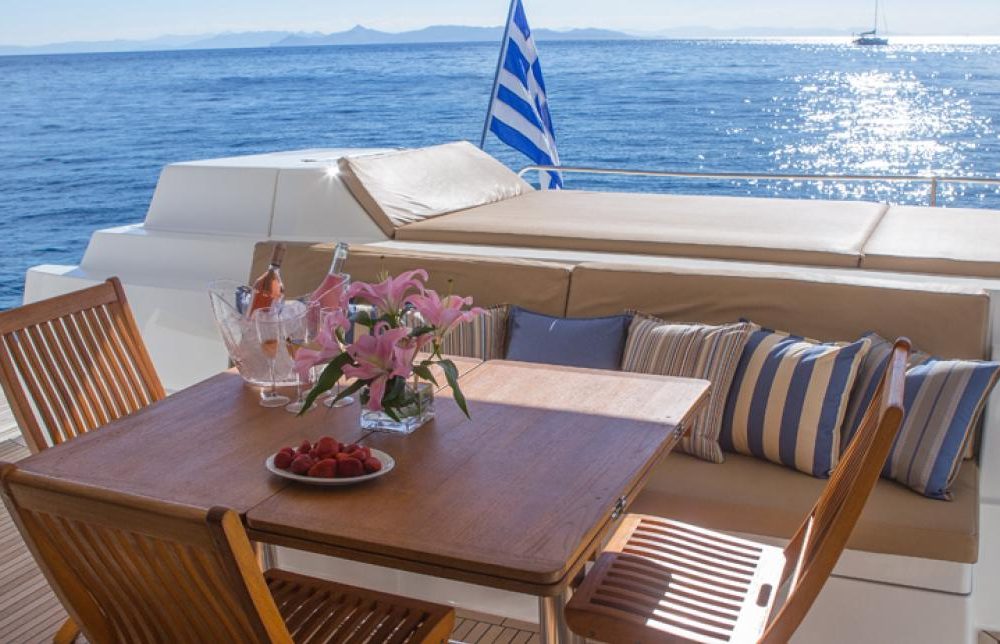 The aft deck, where you probably will spend most of your time at, is stylishly designed for your comfort, either when gathering around the table to enjoy a fabulous meal, filling the air with Mediterranean flavours, or simply relaxing, with an aperitif in your hand, after an exhausting day, playing with the numerous water toys, such as water skis, kayaks, paddle board, wake board, knee board, tubes, snorkelling gear …etc., you have on board. Then again if you like fishing and catch something, your Chef can prepare it for you the same day and serve it to you in the most delicious way, you can imagine.