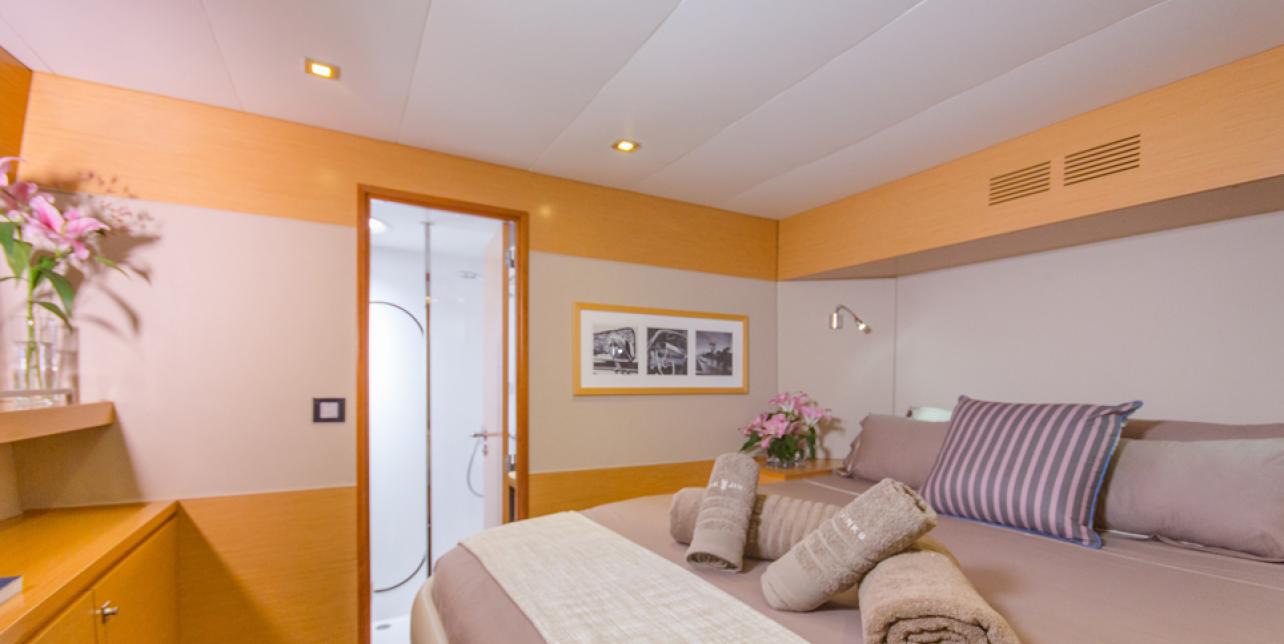 HIGH JINKS can accommodate up to 10 guests in 5 double cabins, which features an exclusive suite with a lounge, desk and spacious designer bathroom and three generous Queen size cabins, all equipped with private bathroom facilities. All cabins have been especially designed for maximum comfort and space and have full air-conditioning, TV, DVD and stereo system integrated.