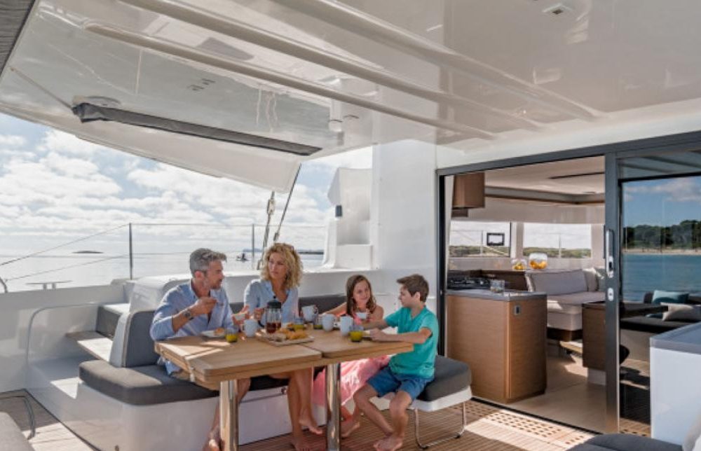 A large open cockpit facing out to sea, large stern skirts enable easy access to the boat and a large modular dining area with removable bench seats to welcome children and adults alike.