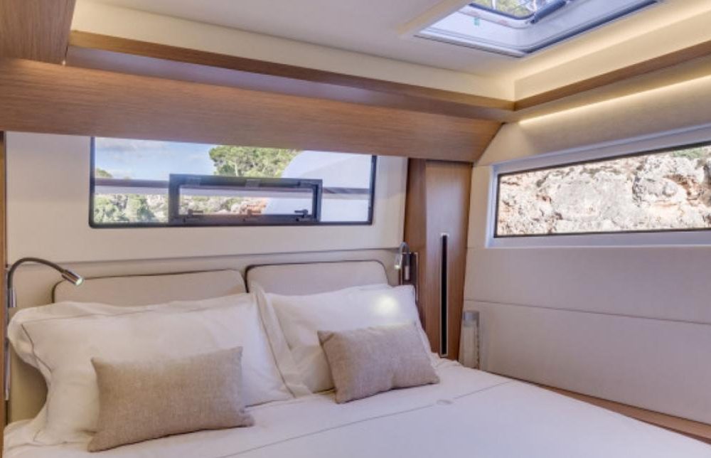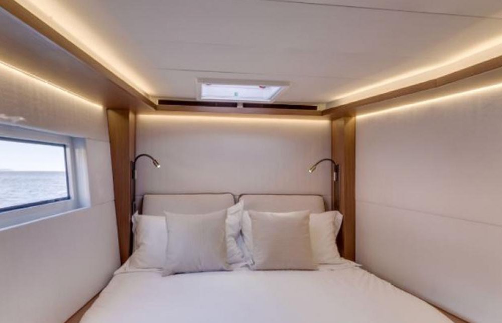 The spaciously designed layout reveals innovative architecture where every detail has been planned to create a warm, homely atmosphere. With her new visual identity, rigging and hull design, she provides increased performance, comprising a unique brand signature. Indeed, the 50’s elegance seduces thanks to the bevelled shape of her hulls, generous volumes and panoramic views, more than ever enhanced.