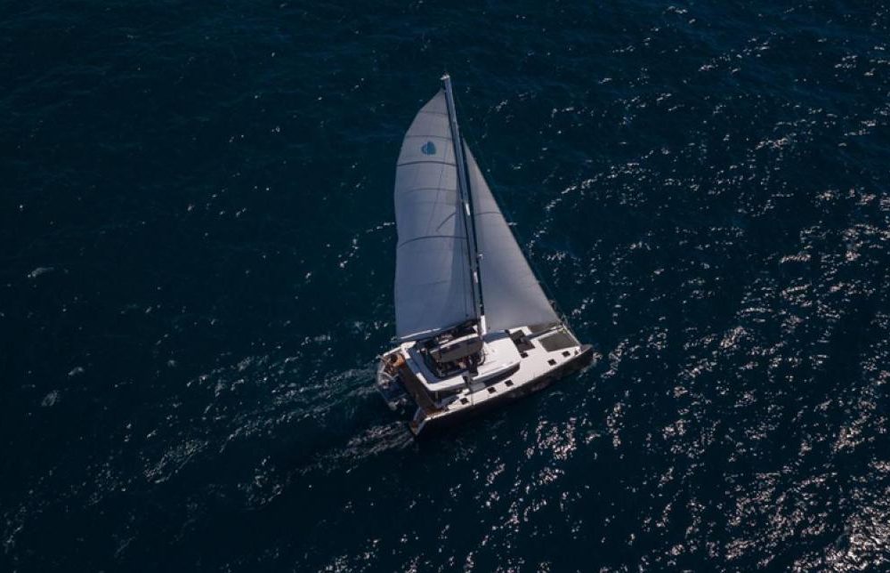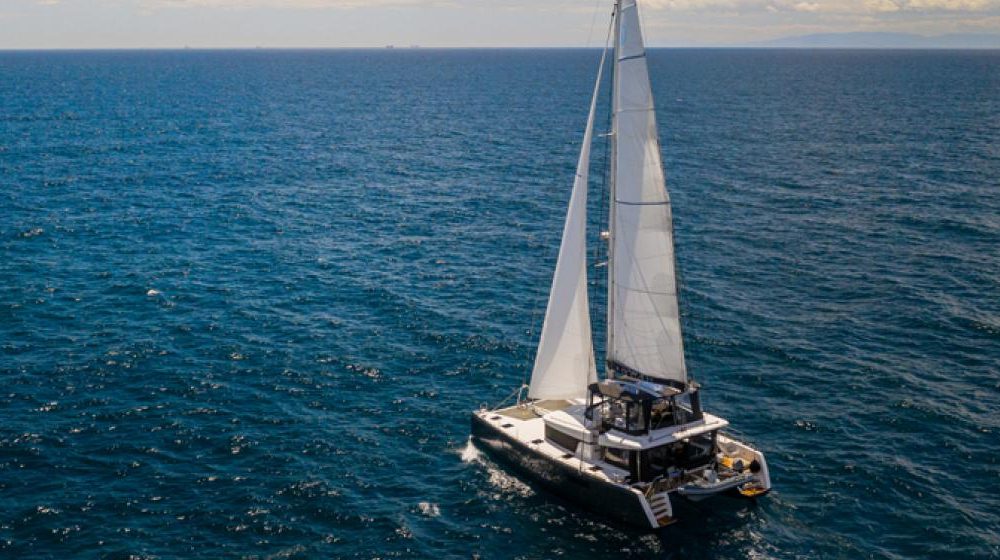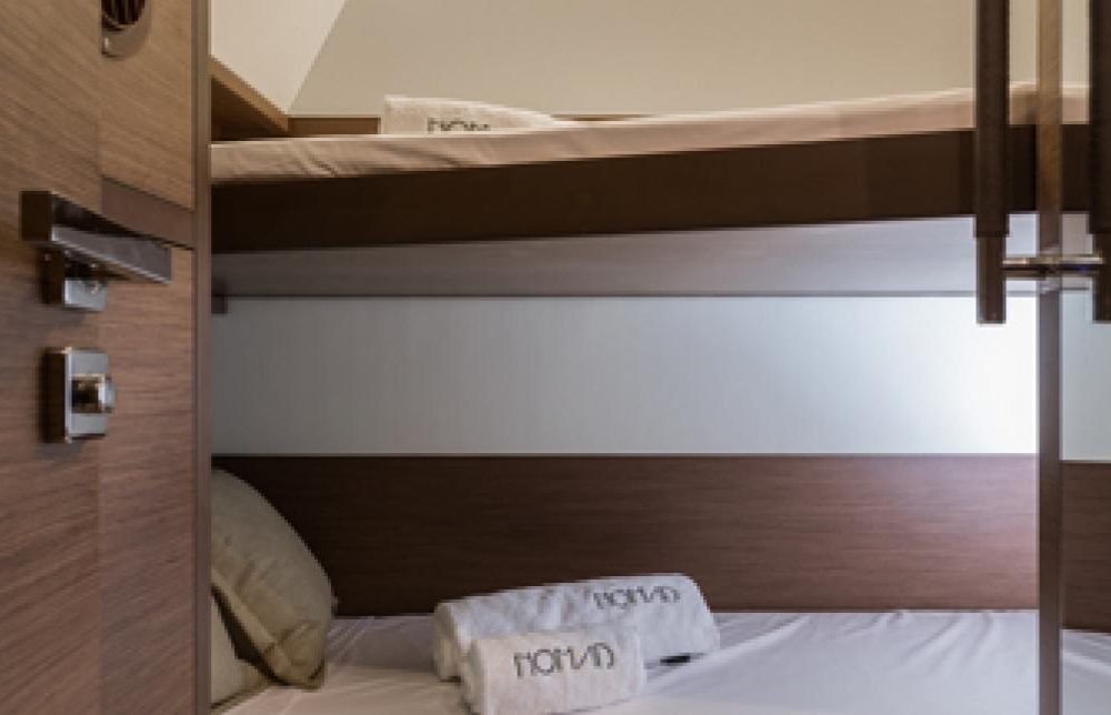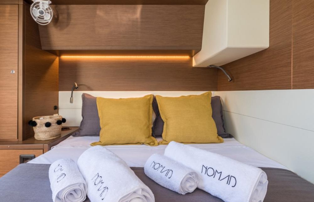With its diamond-shaped vertical bows, bevelled hulls, its as if levitated deckhouse and tall rig, NOMAD is no ordinary catamaran, but its originality goes a great deal further than just its “outer” appearance, or even its interior layout. Superior in terms of elegance, comfort, safety, user friendliness and, it goes without saying, performance under sail. Luxurius and temporary, with soft shades for a harmonious interior continuous horizontal and fluent lines give the interior open and generous spaces continuity between exterior and interior life, a slender exterior design for a boat with a strong character. The saloon encompasses the lounge and dining table to starboard, a large galley in U shape on port side the chart table in the middle, facing out to sea, the “U” galley is equipped with large hot plates, large work space and plenty of storage
