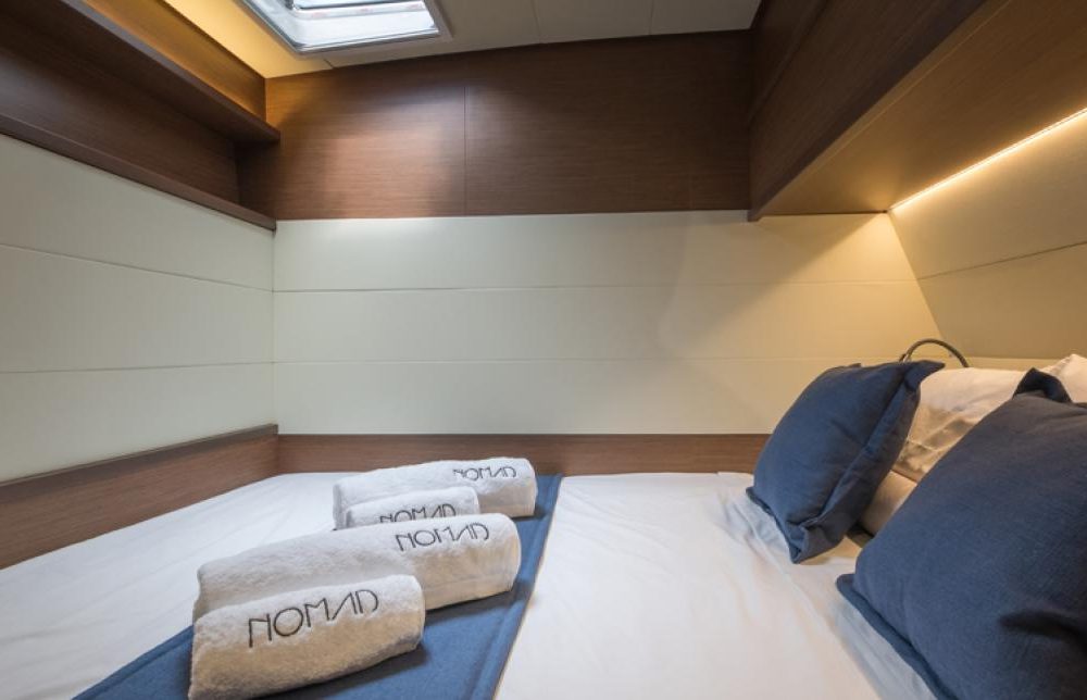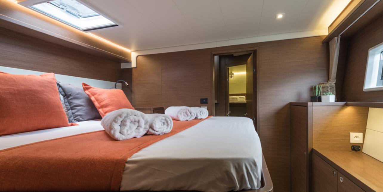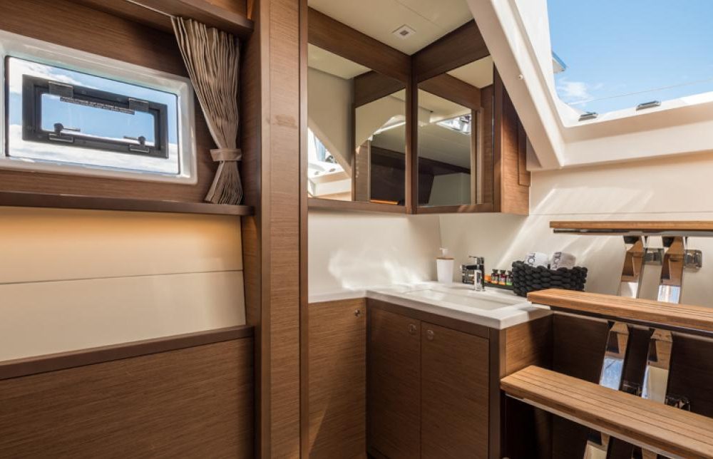 the circulation in the salon is optimized, between the lounge and the galley, all the cabins have large double beds, storage space in keeping with the offshore sailing program of the boat and, of course, an en-suite bathroom with separate shower, the cabins have incomparable natural lighting thanks to the fixed hull windows, together with excellent ventilation thanks to the deck hatches and portholes that open out to the hull-side or to the cockpit.